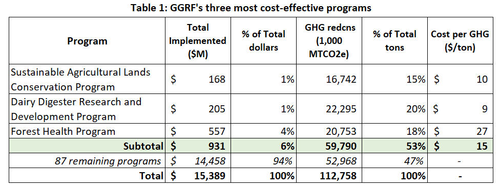 The three most cost-effective programs that have also generated at least 1 million tons of carbon dioxide-equivalent reductions to date include: Sustainable Agricultural Lands Conservation Program (Strategic Growth Council), Dairy Digester Research and Development Program (California Department of Food and Agriculture), and Forest Health Program (California Department of Forestry and Fire Protection). These three programs are responsible for 6% of implemented funding to date and have delivered 53% of the total emissions reductions of the GGRF portfolio (Table 1).