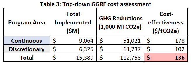 One approach, which could be thought of as a top-down approach, involves dividing total dollars spent ($15.4B) by total emissions reductions (113 Mt). This results in an estimated cost-effectiveness of $136/ton (Table 3). This is the approach currently adopted as part of the CCI program.