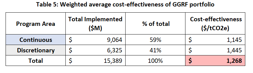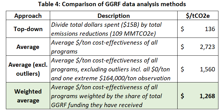 The second more formal approach is to calculate a weighted average across all of the programs. This involves weighting the $/ton estimates for each program by the amount of funding implemented by the program. For the purpose of the overall $/ton estimate, this puts greater emphasis on programs that are key to GGRF and responsible for a larger share of funding, and a lower emphasis on those that are not.