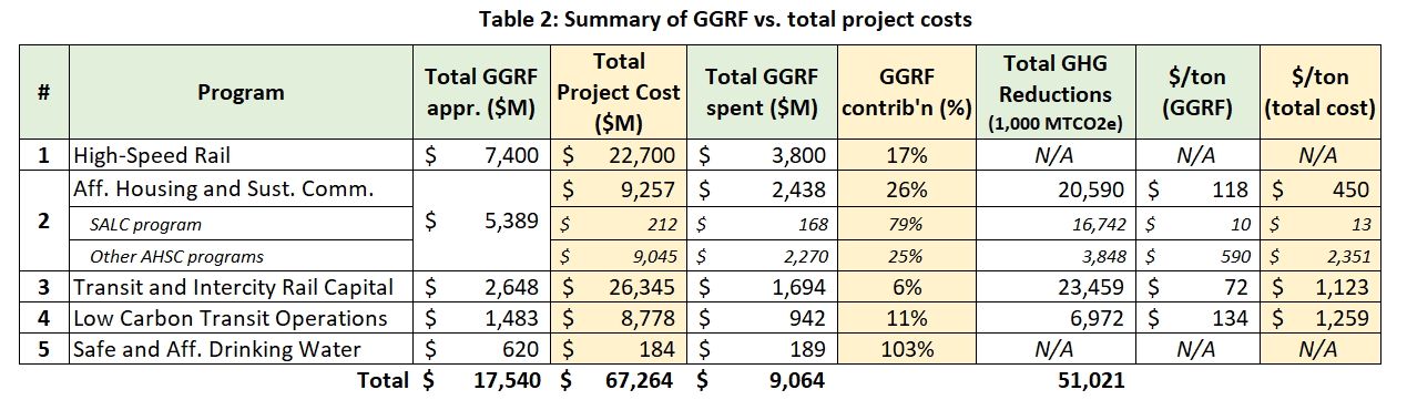 Table 1 calculates cost-effectiveness by dividing total GGRF implemented costs (column 2) by total project GHG reductions (column 4). However, it is important to note that GGRF grants typically cover only a portion of total project costs. For example, the SALC program has implemented $168 million in GGRF funds, but total project costs are $212 million (i.e., GGRF has provided 79% of total funding). Meanwhile, GGRF cost-effectiveness estimates are based upon total project emissions reductions, and not, for example, a proportionate amount equal to the contribution of GGRF.